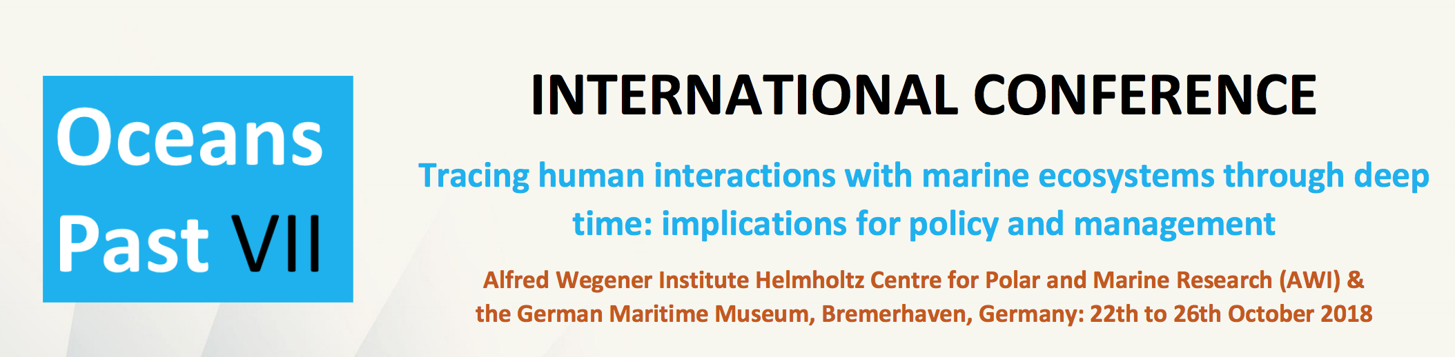 Oceans Past VII will be a celebration of Oceans Past like never before. You will meet colleagues from around the world, have direct access to politicians and managers, and enjoy special sessions, mini-symposiums, and exhibitions. Come join us for a defining conference!